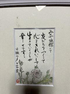 | 12月25日が祥月命日のHさんの遺言とも言える絵手紙です。本当にこのような生き方をされたかたですが、決して簡単ではありません。これはある程度認知機能が衰えている中での言葉でありますから、なお真実味があります。 |