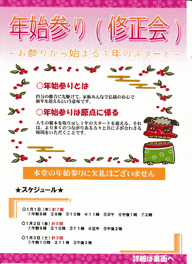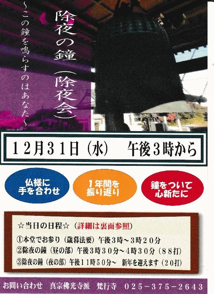 | 今年もいよいよ最終盤。除夜の鐘(歳暮法要)と年始参り(修正会)の準備です。今年はここにきてお天気も落ち着き、穏やかな日が続いています。そうはいっても除夜の鐘は厳しい寒さが待っていますので、少しでも温かい服装をして来ていただきたいと思います。何とか大雪は避けられそうですが、関越道では大きな事故もあり、規制される方は十分な準備と注意をお願い致します。こちらも準備万端お待ち申し上げております。 |