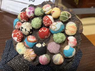 本堂にはご門徒さんの造った作品が飾られています。今までにもかなりの作品が展示されていましたが、現在は「蓮の実ちりめん細工」です