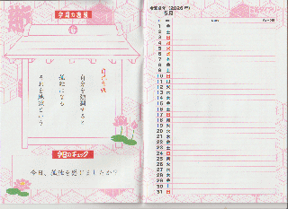 | 「オレの掲示板」は5冊発行致しましたが、一方通行ということもあって参加型のダイアリーを作成しました。是非生活の中で日記・予定表・自分の秤として、常にお供しながら使っていただきたく配布させていただきました。少しずつ紹介致しますが、健康手帳的に使っていただければ幸いです。 |